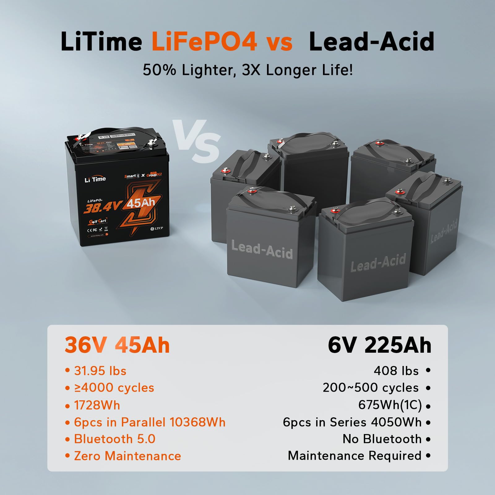 Litime 3 Pack 36V 45Ah GC2 Bluetooth LiFePO4 Battery, Built-in 90A BMS, Max. Continuous Discharge Current 90A, Low-Temp Protection, 4000+ Cycles, Perfect for 36V Golf Carts, Trolling Motors—