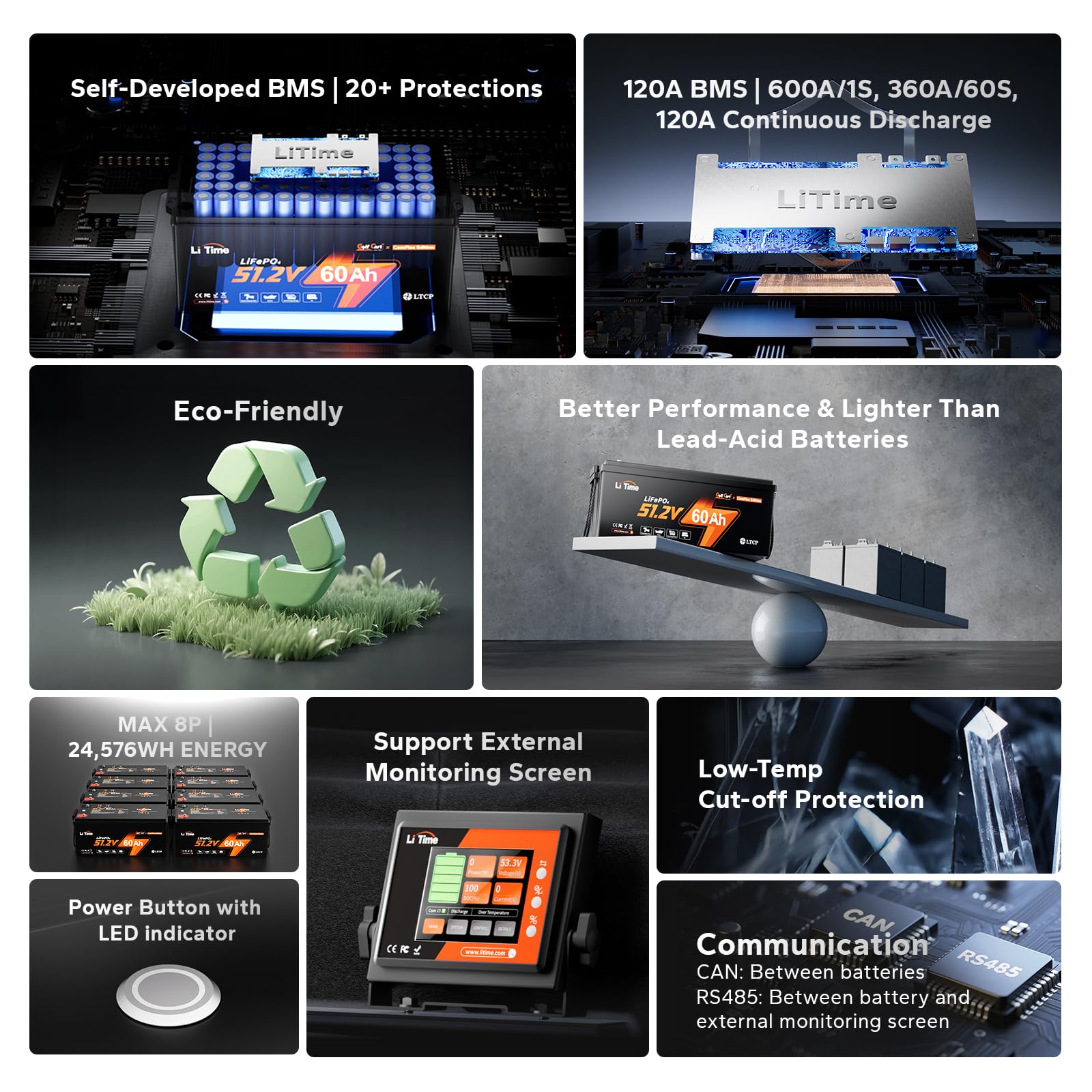 - Advanced 120A BMS(2C): Featuring LiTime’s self-developed BMS board, Engineered with upgraded 120A(2C) continuous/600A(1S) peak discharge capacity, the LiTime 48V 60Ah LiFePO4 battery delivers uncompromised power for 4kW motors. Whether you’re braking, accelerating, climbing a slope, or passing through rough terrains, it provides strong and stable power,eensuring you conquer every challenge with confidence.